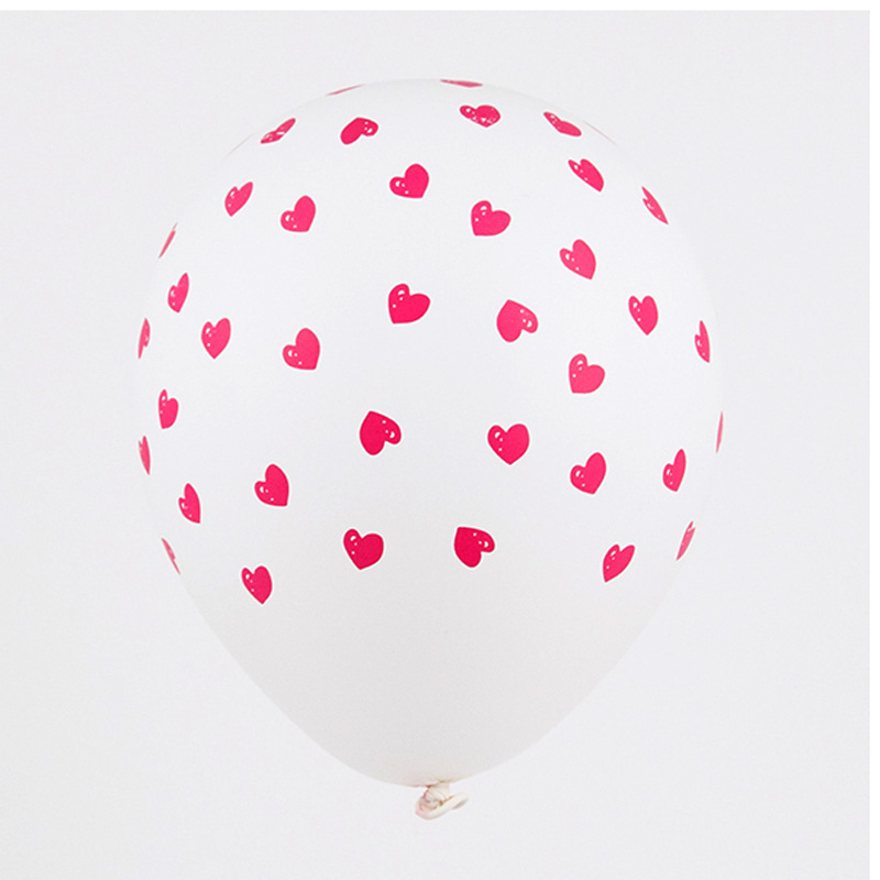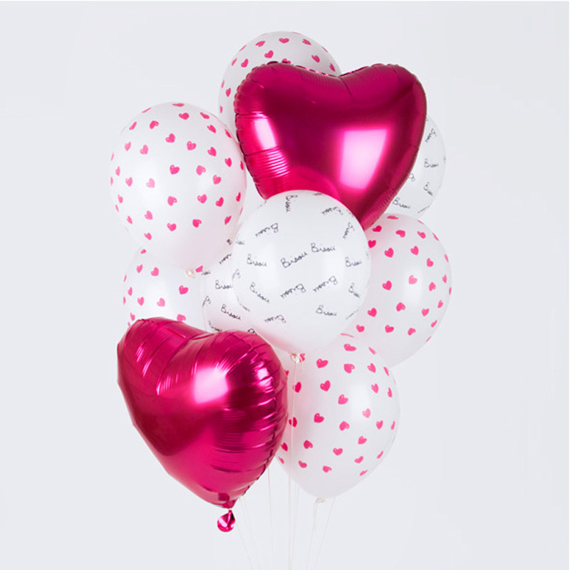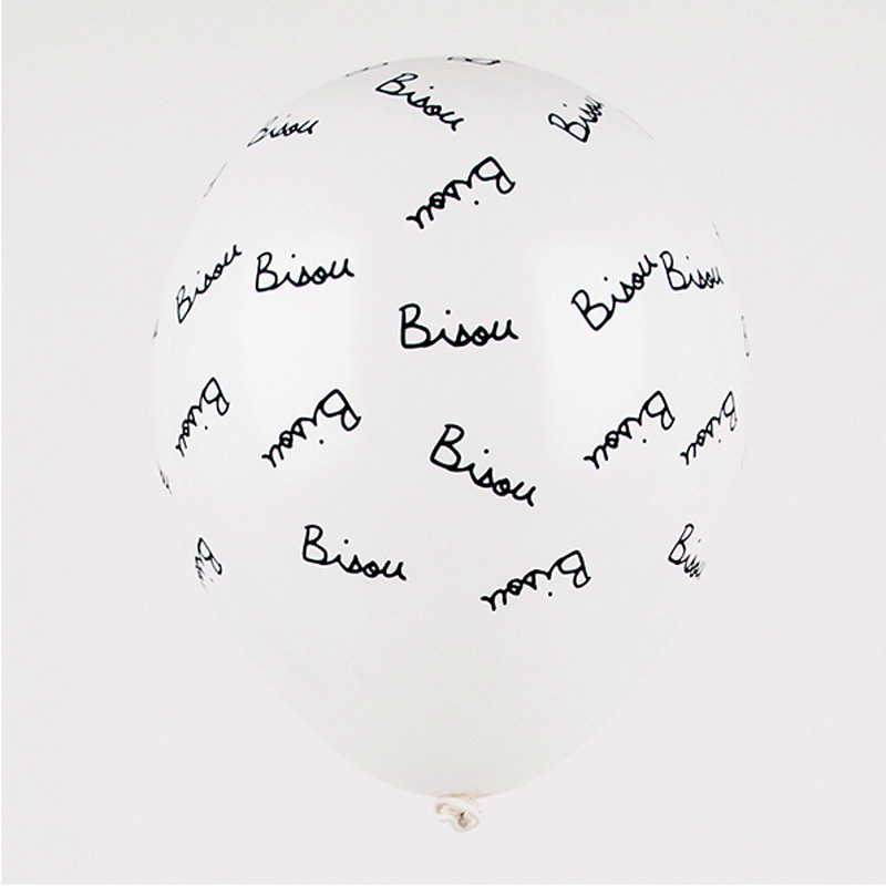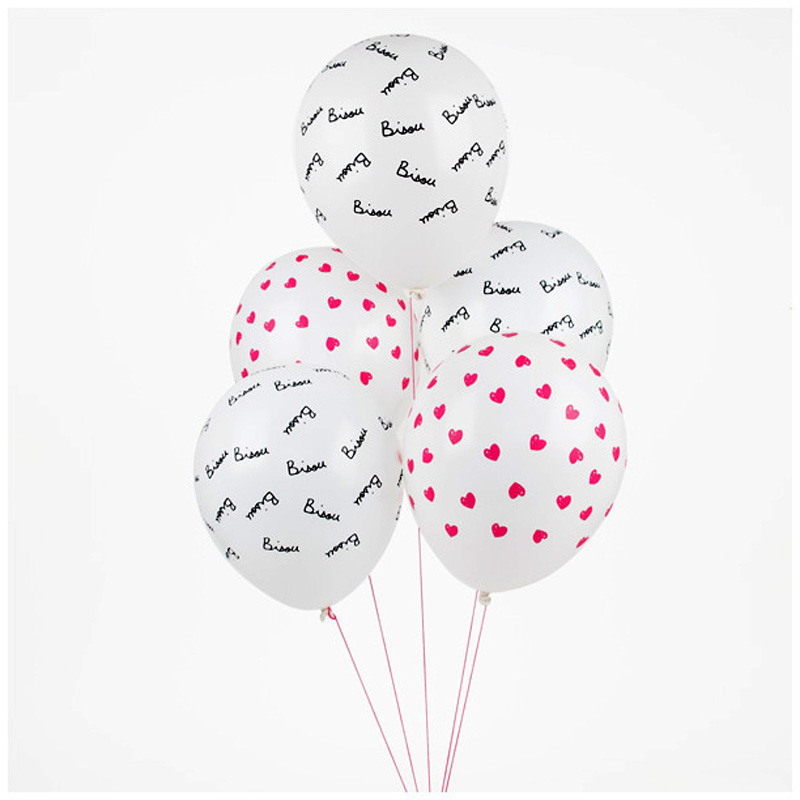 5 printed balloons with little red hearts and the word "bisou" (kisses) written on them; designed by Mathilde Cabanas.