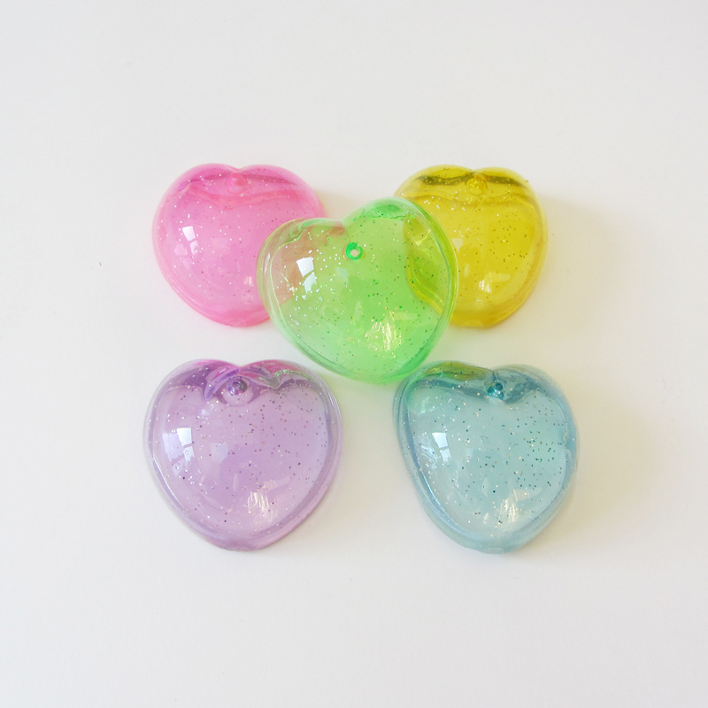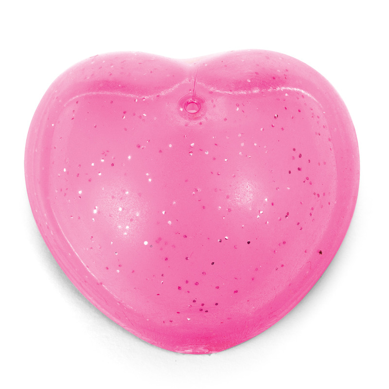 Glittery dome popper in the shape of a heart. Turn the plastic toy inside out and then place it on a flat surface. The heart-dome will invert to its original shape instantly, the force of which propels the popper high into the air. Available in a variety of colours.