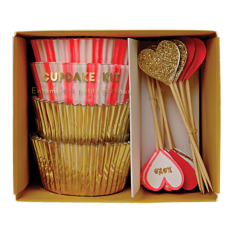 Make your Valentine's Day cupcakes shine with this beautiful cupcake decoration kit. It features 2 styles of cupcake case and a selection of love heart toppers all embellished with lots of gold glitter and shiny gold foil.