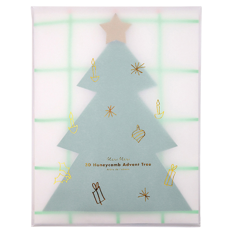 Pack contains 1 advent calendar with 3D tree, 3 trays with pop-open doors and decorations inside.