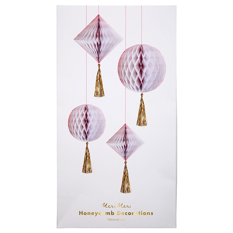 These stylish Christmas decorations are crafted with honeycomb paper and finished with a metallic gold tassel and suspended on a coral pink cord. They come in globe and diamond shapes.