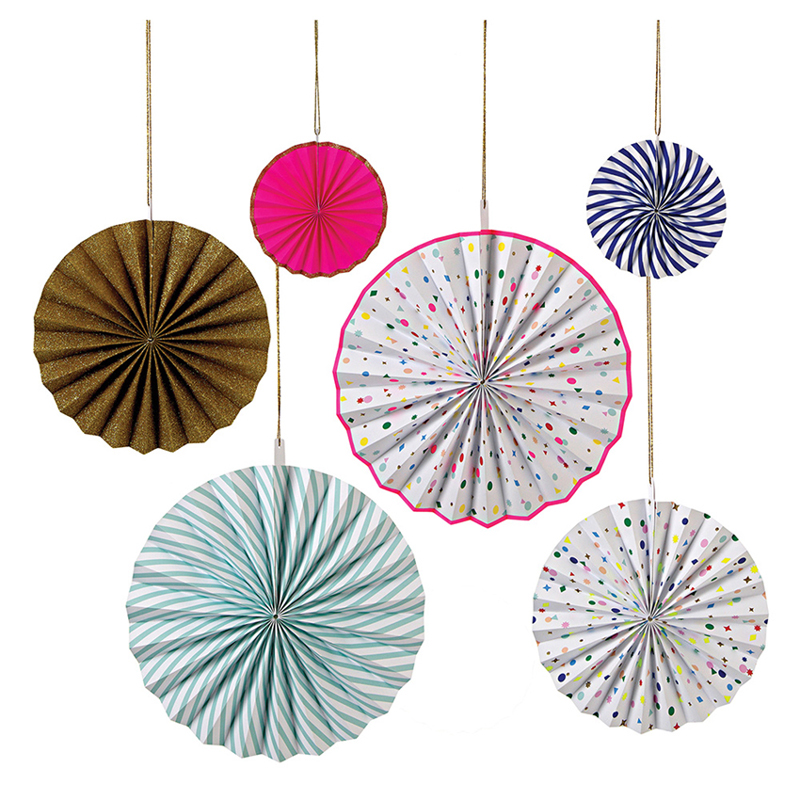 These stylish pinwheels can be used to decorate a room for a celebration. The pinwheels come in colorful patterns and utilize a shimmering gold thread. Embellished with gold glitter.