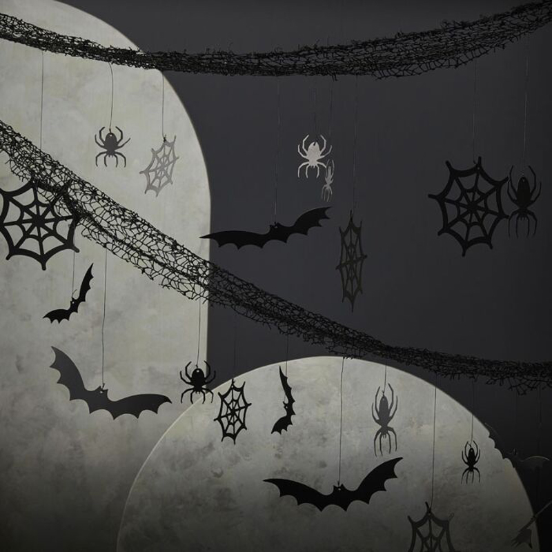 Create a spine-chilling atmosphere at your Halloween party with our Halloween Backdrop with Hanging Spiders, Bats and Cobwebs.
