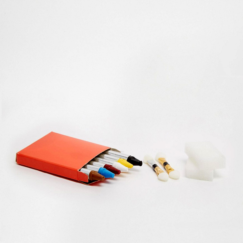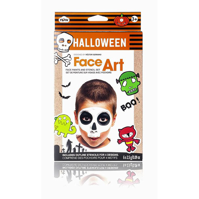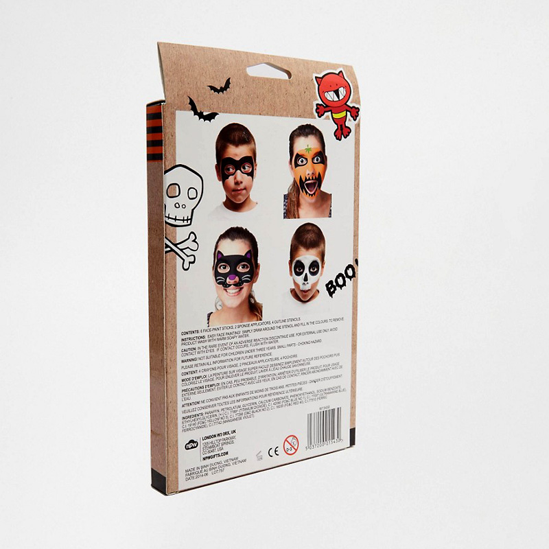 Halloween Face Art with face paints and stencil set. Simply draw around the stencil and paint on the colours. Pack contains 6 face paint sticks, 2 sponge applicators and 4 outline stencils.