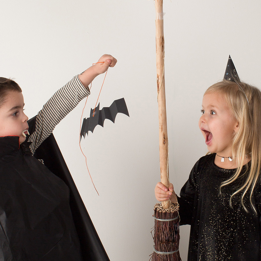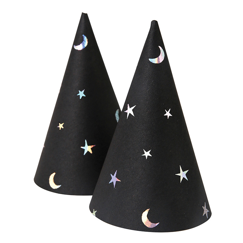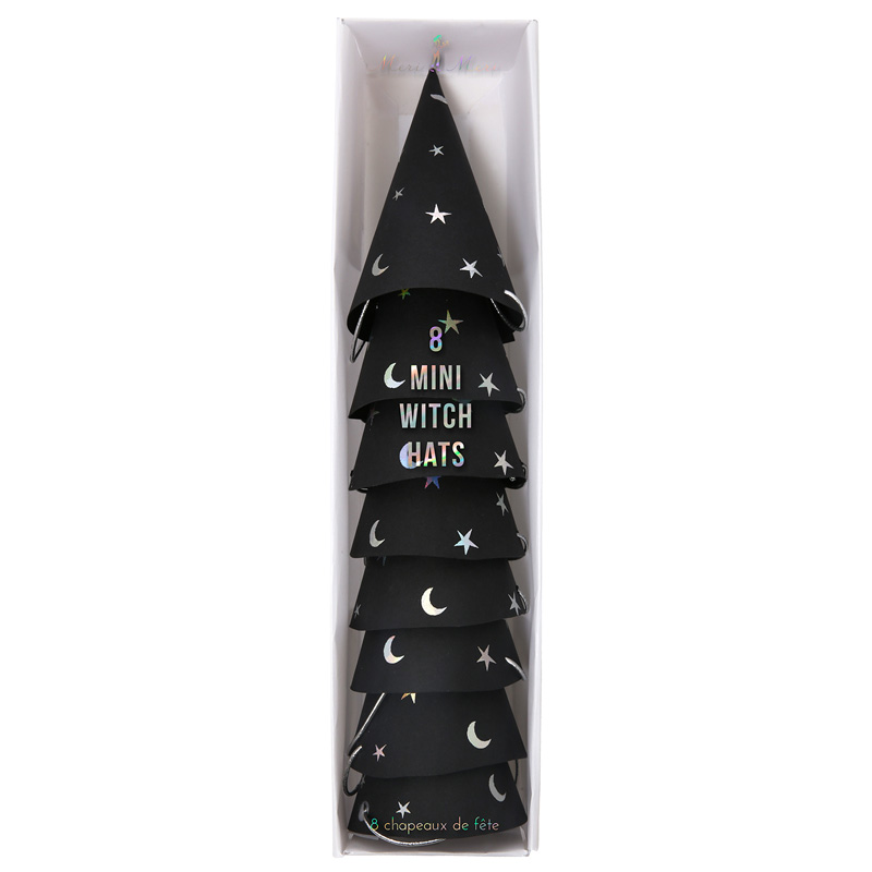 Add more spookiness to your Halloween celebration with these mini witch hats. The hats are decorated with moon and star patterns in silver holographic foil and have metallic string ties.