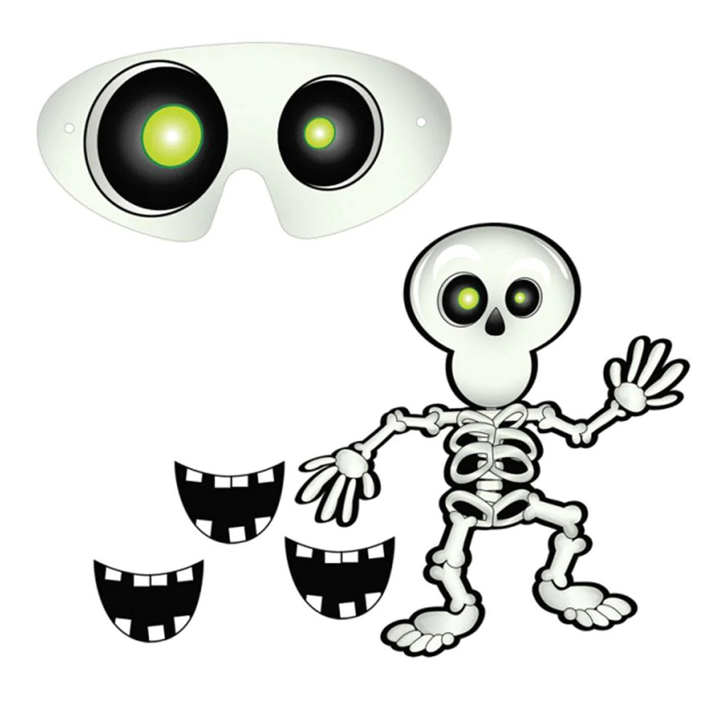 Pack Size: 1x skeleton poster, 12x self-adhesive smiles and 1x blindfold