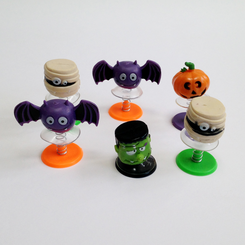 A set of 6 Halloween character jump-up toys. Each pack contains a mix of four different characters: mummy, Frankenstein, purple bat and pumpkin. Press down on the character and wait for it to jump up into the air!
