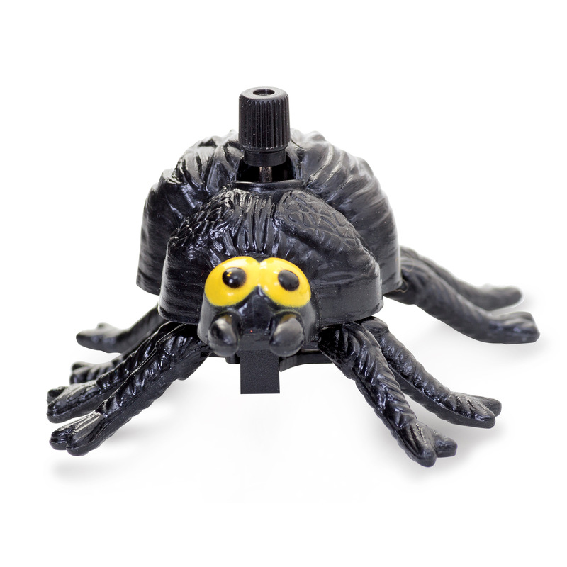 Clockwork spider toy with black textured body, bright yellow eyes and pincers. Wind up the mechanism on his back and release to make his legs crawl forward.