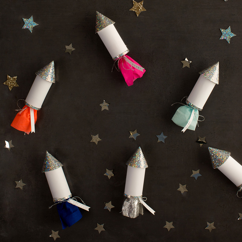 Add something a little different to your festive celebrations with these confetti rockets! Each rocket is embellished with multi-colored glitter and contains 6 tissue hats, 6 jokes and a felt moustache as well as lots of colorful confetti.