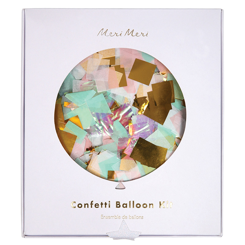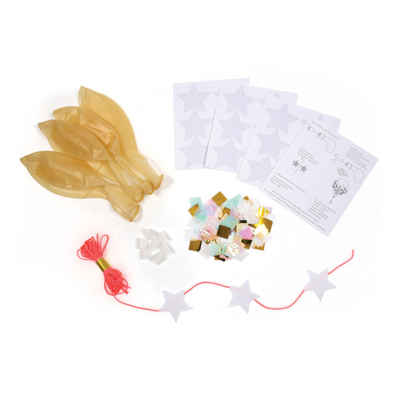 Pack contains 8 balloons, mixed confetti, 8 sheets of glittered stickers, string and cardboard tube for loading confetti into the balloon.