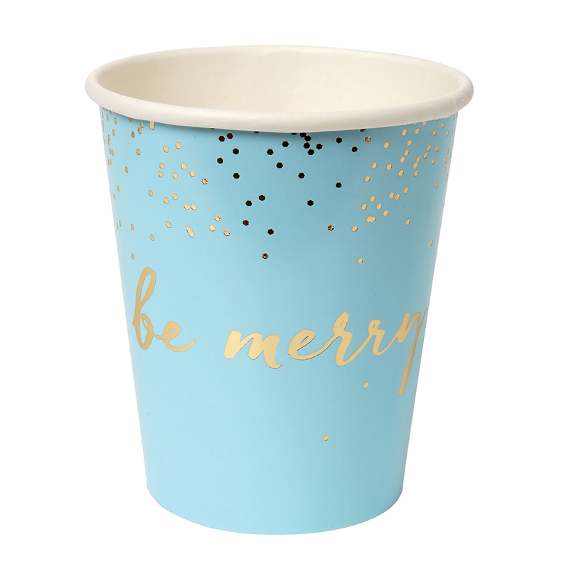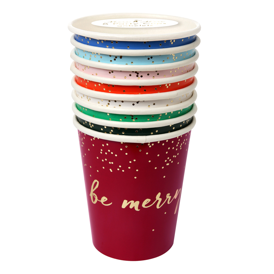 These stylish party cups come in a range of seasonal colors, perfect for a Christmas celebration. Each cup has the slogan 'Be Merry' printed in shiny gold foil.