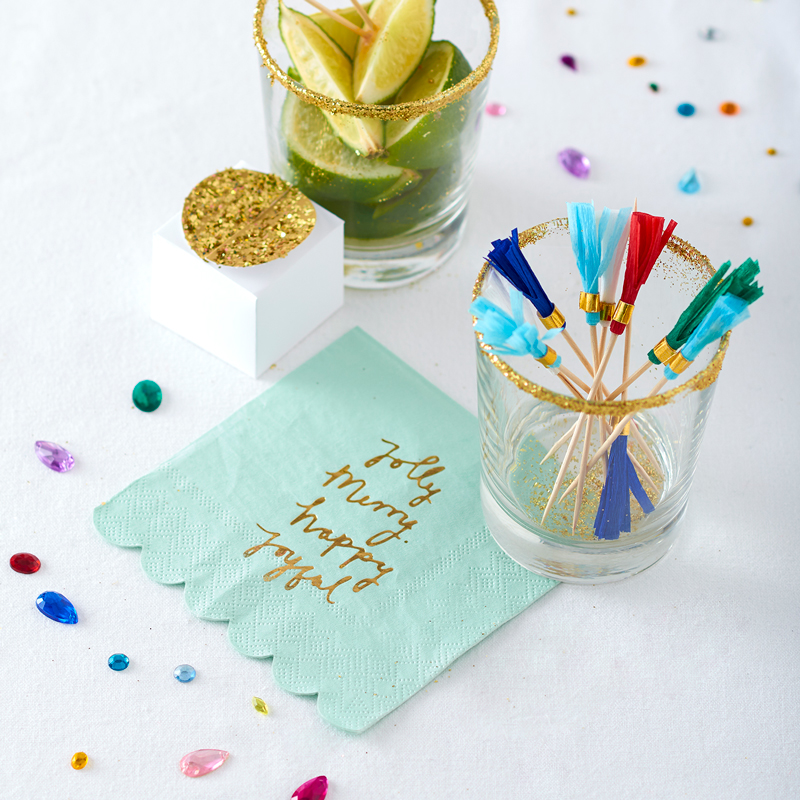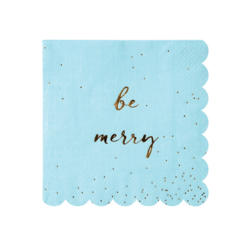 A set of small Christmas napkins in bold, seasonal colors, decorated with a scollop edge and embellished with the shiny gold foil slogan Jolly, Merry, Happy, Joyful.