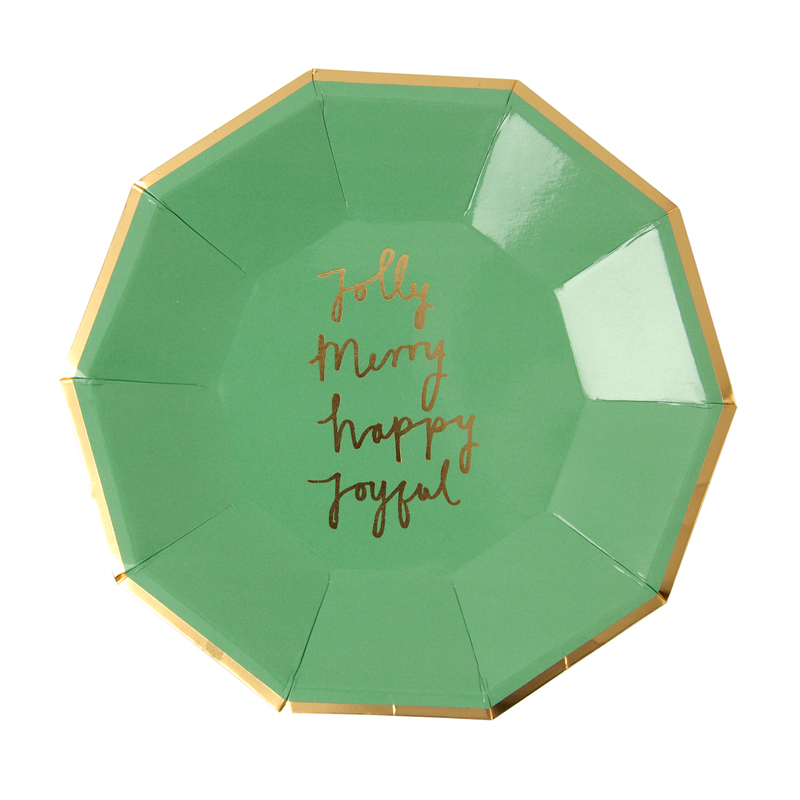 This set of small party plates will add color to your Christmas celebration. The plates come in 4 styles with Jolly, Merry, Happy, Joyful slogans. The plates are embellished with shiny gold foil and have a gold band edge.