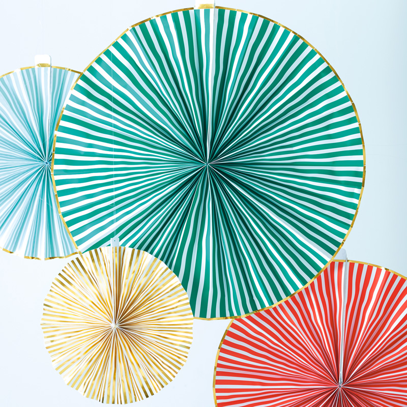 A set of huge pinwheel decorations to decorate your festive scene with radial stripe patterns in Christmas colors and finished with shiny gold foil.