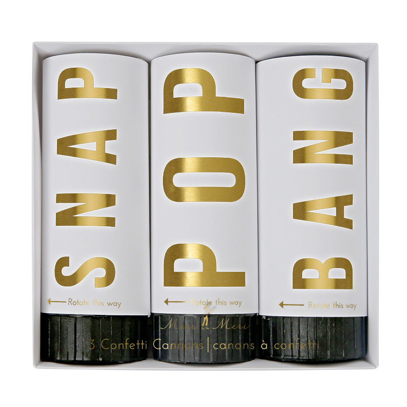 Snap, Pop and Bang! These confetti canons will raise the fun levels at your celebration. Each canon is embellished with shiny gold foil and contains streamers in bright colors and shiny silver.