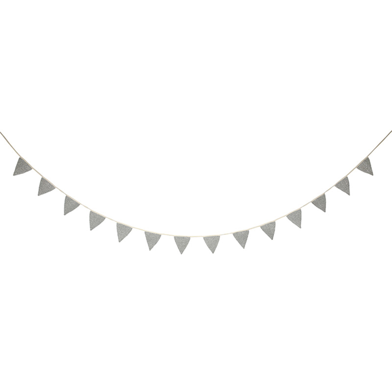 A beautiful garland with knitted silver triangle flags attached to an ivory colored yarn with flecks of silver. The garland comes in a stylish drawstring bag.