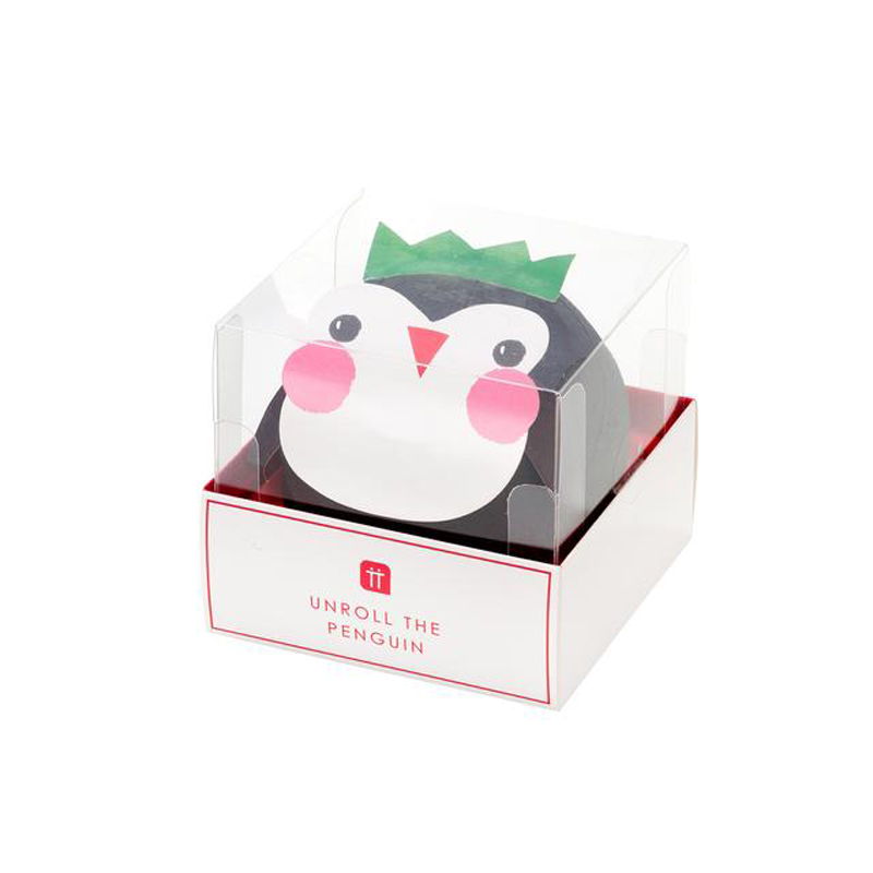 Unroll the penguin! Made from crepe paper this friendly penguin contains 13 novelty toys, 12 entertaining scrolls and 4 paper crowns to surprise and delight!