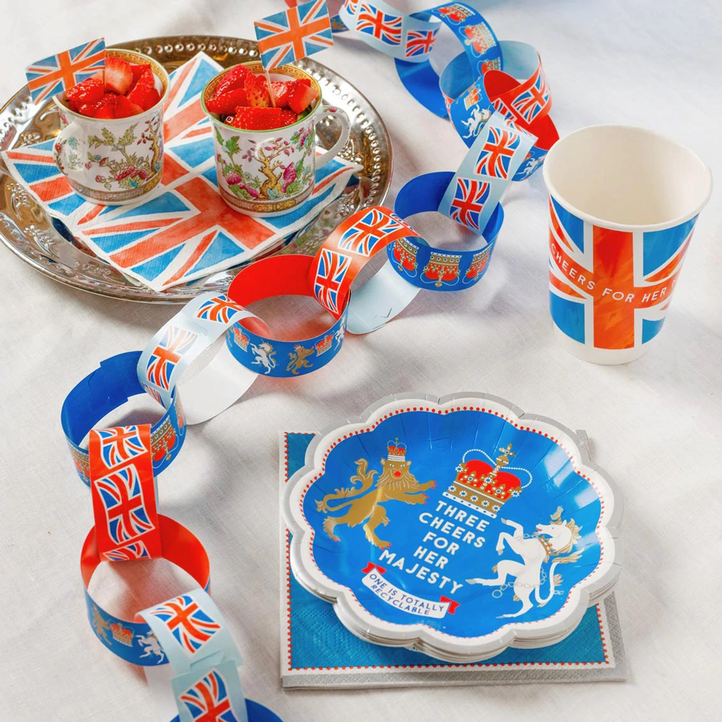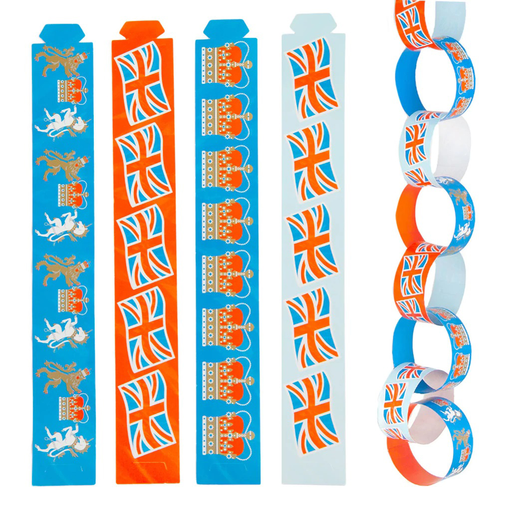 These paper chains are perfect as party decorations for the upcoming Queens Platinum Jubilee. Featuring Union Jack flags, the Royal Coat of Arms and the Queens crown, take a strip and curl until the two ends meet. Next, loop your next strip through the centre of the circle and attach the ends once again. Repeat until you've reached the length of chain that you want. A great arts and crafts activity for kids or adults and an eye-catching addition to any room when strung from the ceiling, door or along a mantlepiece.