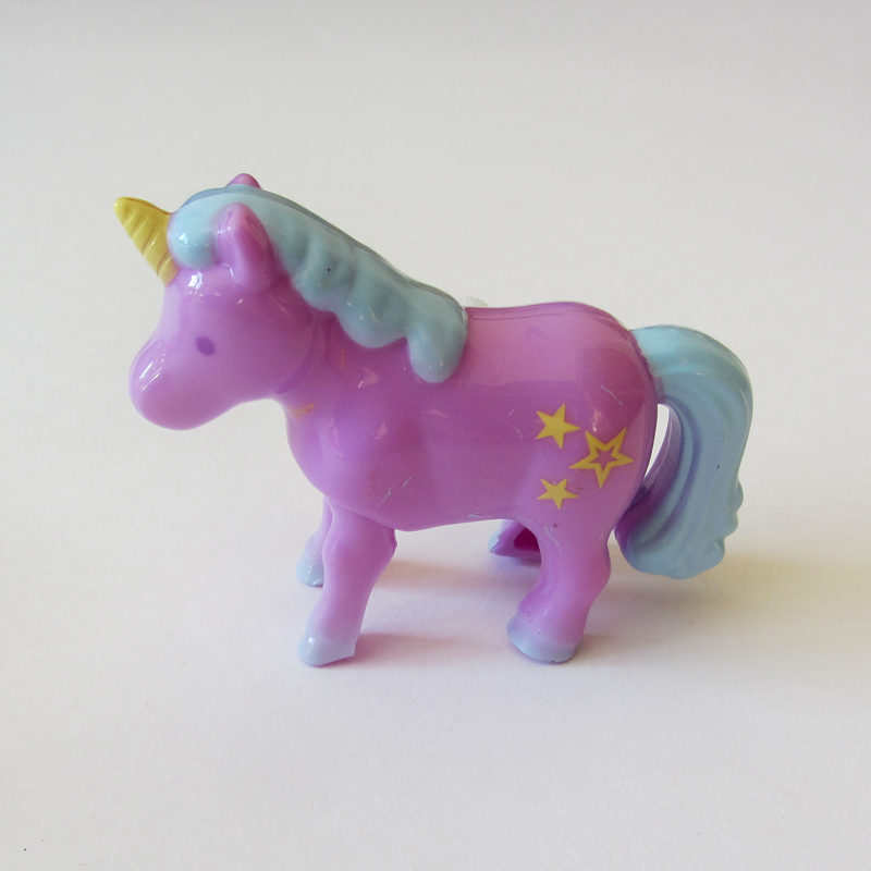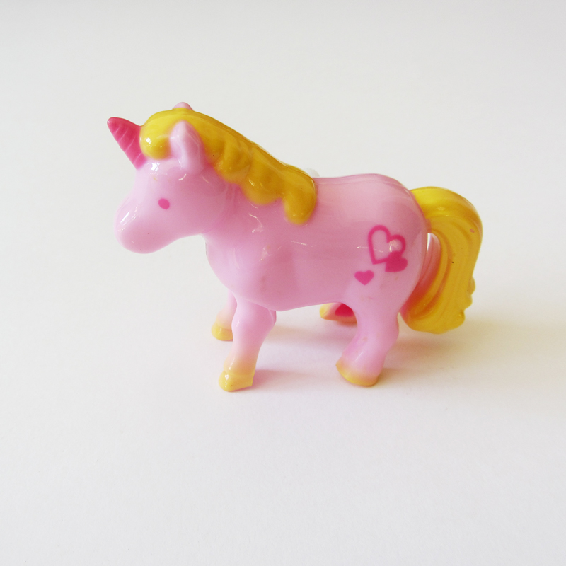 Wind-up unicorn toy with clockwork hopping action. Prime the mechanism and then release to make the unicorn hop on its front legs, propelling the toy across the surface on which it is placed.