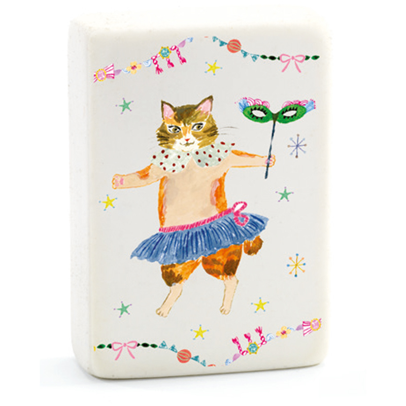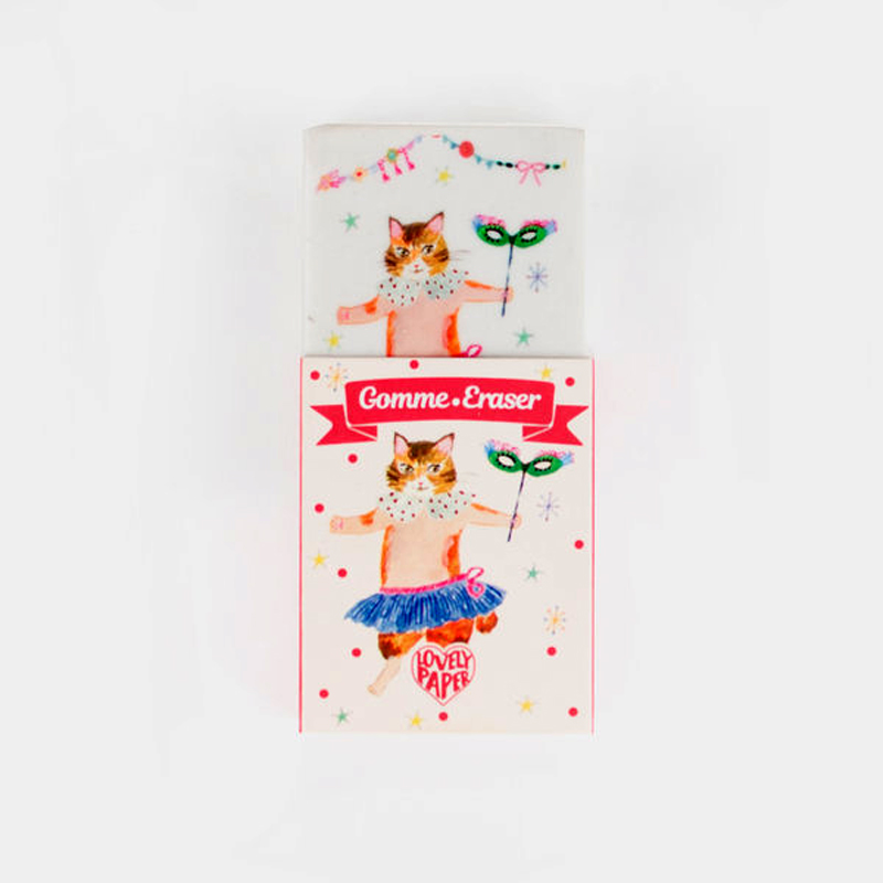 A cute and playful rubber eraser that will make a sweet addition to any pencil case. Features a delightful illustration of a friendly feline dressed up to the nines in a party tutu. We have matching notebooks too.