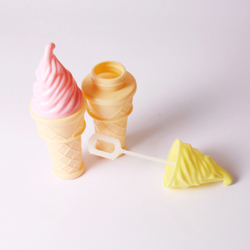 A scoop of ice cream in a wafer cone, filled with bubbles for a sweet party bag filler. This tasty-looking ice cream is filled with bubble mixture. Unscrew the soft peak of ice cream to find a bubble wand attached to dip in the liquid-filled wafer cone and blow streams of light and floaty bubbles