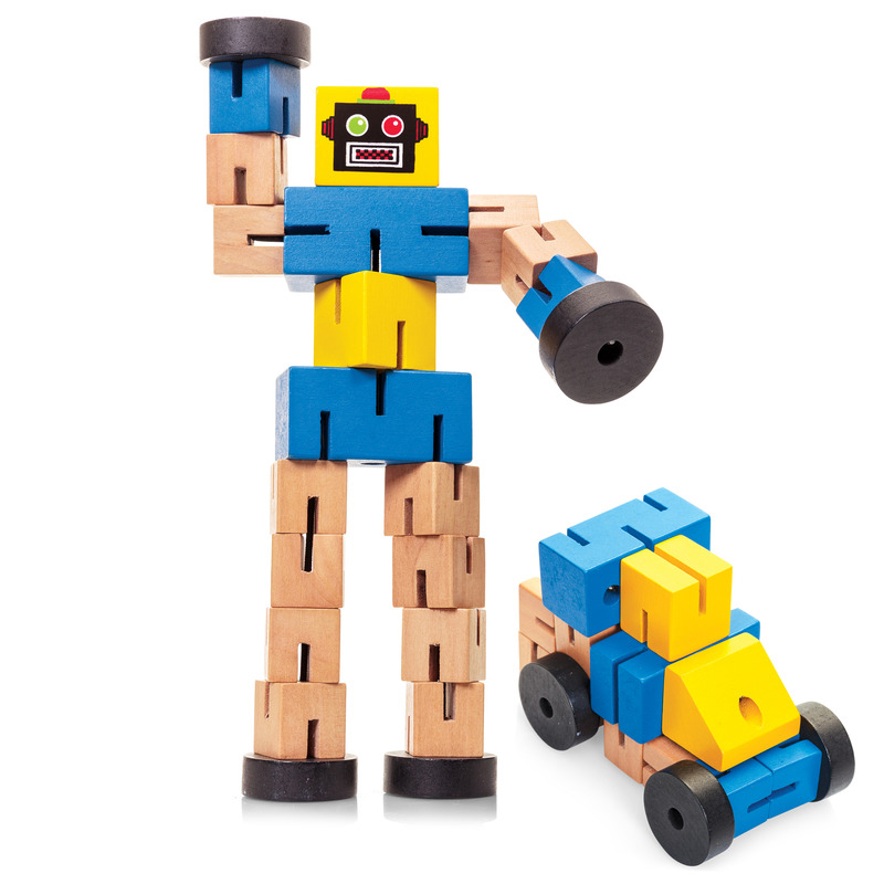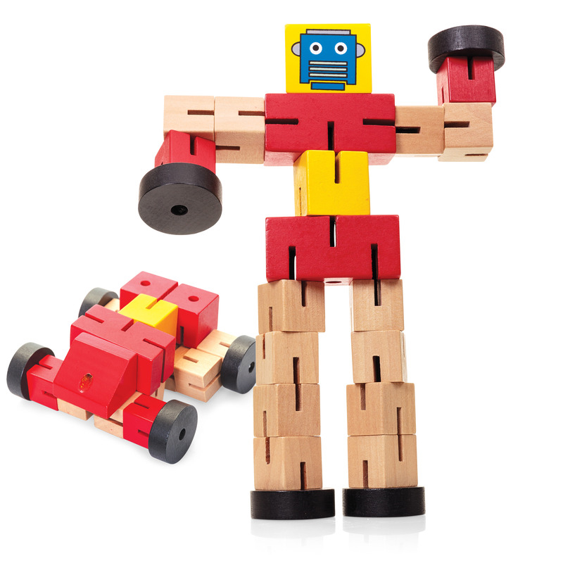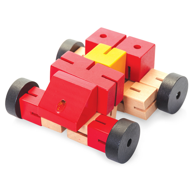 Transforming robot toy made from several wooden blocks linked together. Each block contains a series of grooves, allowing them to twist and lock into hundreds of different configurations. The standard formation is a robot figure, but the parts can be repositioned to form a variety of different car and vehicle shapes.