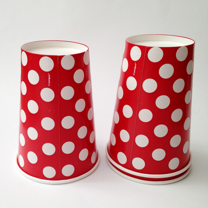 Set of 6 paper cups with retro white spots on a deep red background. We also have a matching range of napkins and party bags to complete your theme.