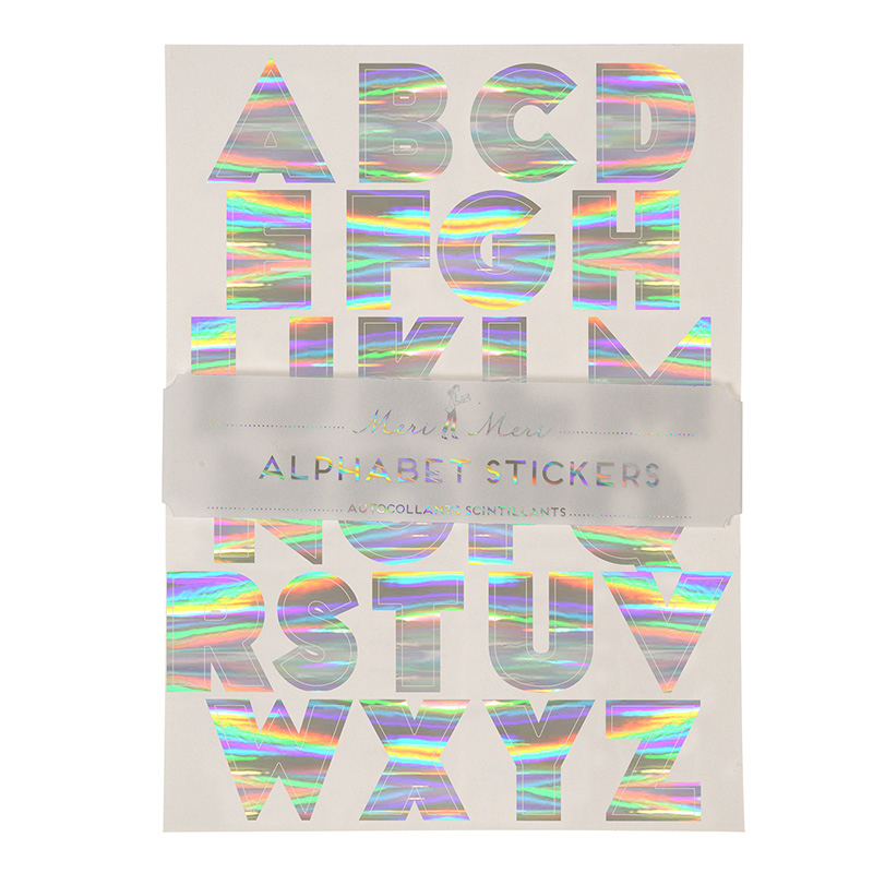 A set of alphabet stickers to add a message to a gift or to use as decorations. Each letter is embellished with holographic silver foil giving it a colourful shimmer.