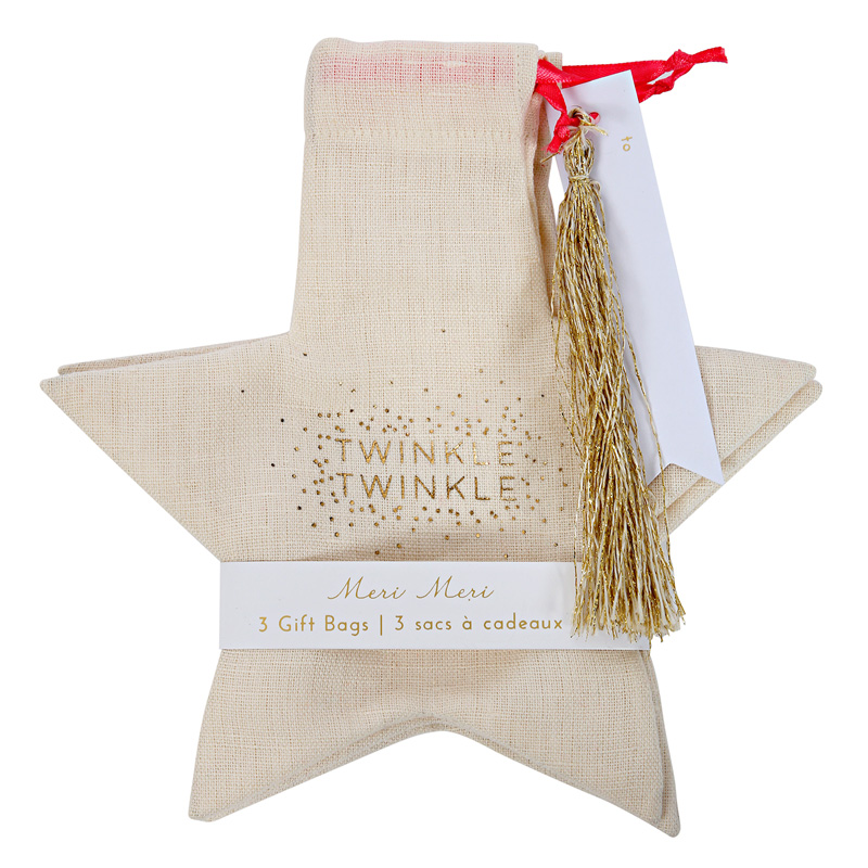 A set of beautifully crafted cotton gift bags in the style of a twinkle star embellished with metallic thread and luxury metallic tassel. The bags come with a paper tag.